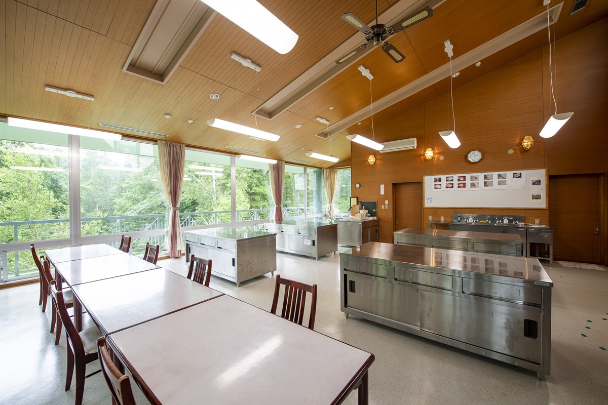 ご宿泊のお客様の夕食・朝食の会場となる食堂は、周囲の森や中央アルプスの山並みを望む明るい雰囲気のスペース。冬は雪景色を見ながらお食事が楽しめます。週末・祝日にはランチ営業も行っています。